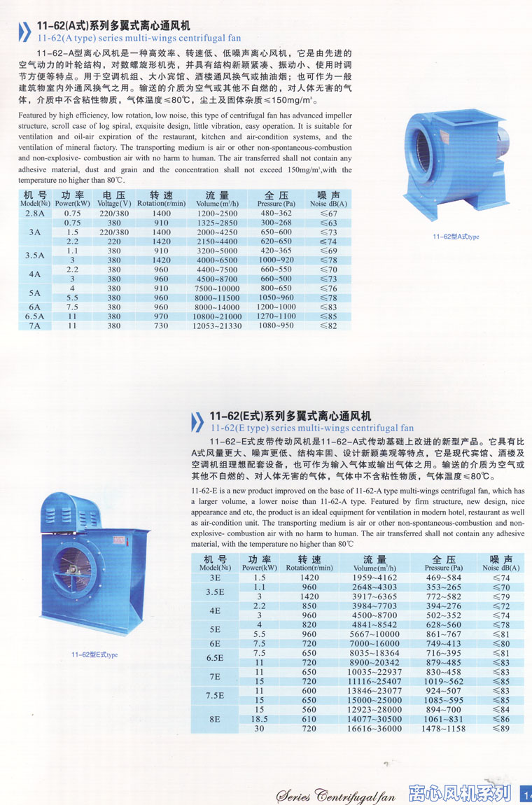 11-62-E式皮带传动离心通风机是在11-62-A式传动的基础上研制出来的一种新型产品。它具有比A式风量更大,噪声更低、结构牢固、设计新颖美观等特点,它是现代大小宾馆、酒楼几大、小型空调机组配套设备,它可作为输入或输出气体之用,为净化工业开创新领域。